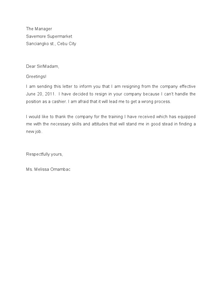 Resignation letter of cashier. Your last day of employment. You don’t have to give a reason when you resign, but under some circumstances, you may want to let your employer know why you’re moving on. Why you are leaving (optional).